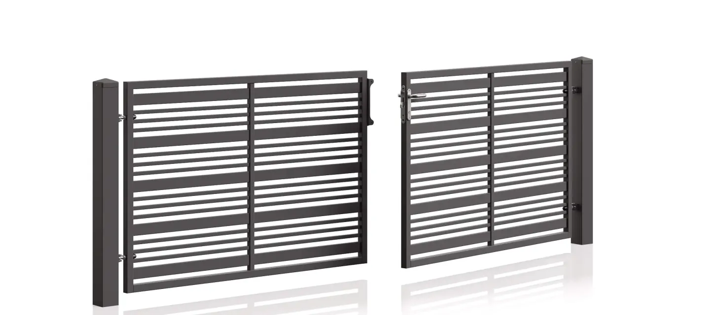 Jedes zweiflügelige Drehtor wird entsprechend den tatsächlichen Maßen und Besonderheiten des Geländes hergestellt. Wir liefern sowohl klassische Konstruktionen mit Spitzen und schmiedeeisernen Motiven als auch blickdichte zweiflügelige Einfahrtstore, die mehr Privatsphäre und Sichtschutz für Ihr Grundstück bieten. Bereits in der Anfangsphase können wir einen 3D-Entwurf erstellen, z. B. für ein zweiflügeliges Garagentor oder ein System für Industriebetriebe mit einem zweiflügeligen Industrietor.